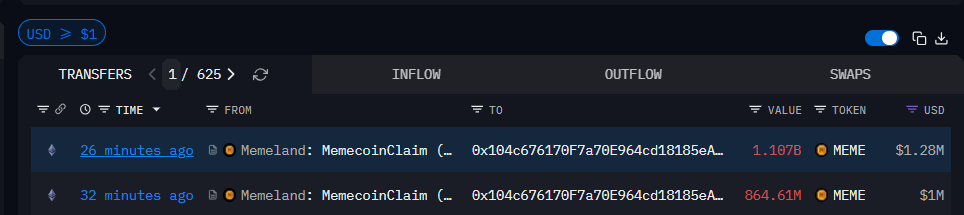 วาฬตัวหนึ่งถอน MEME มากกว่า 1.97 พันล้านเหรียญจากที่อยู่ที่ทำเครื่องหมาย Memeland และฝากเข้า Binance