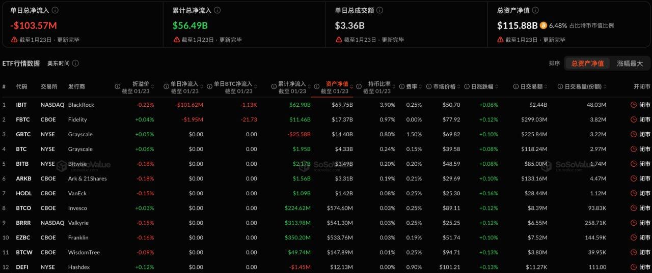 Odaily ข้อมูลจาก SoSoValue แสดงให้เห็นว่า Bitcoin Spot ETF มีการไหลออกสุทธิรวม 104 ล้านดอลลาร์สหรัฐเมื่อวานนี้ (เวลา Eastern วันที่ 23 มกราคม)