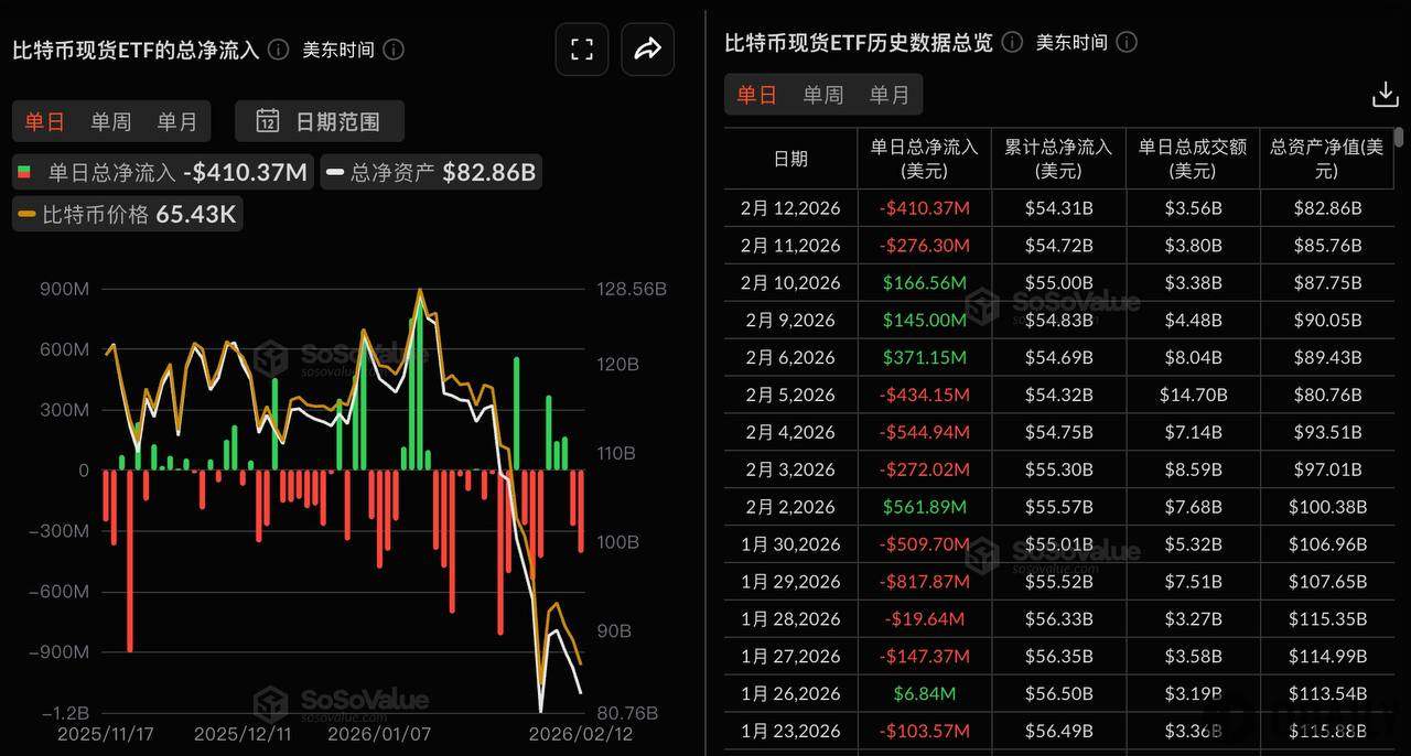 Odaily ตามข้อมูลจาก SoSoValue เมื่อวานนี้ (วันที่ 12 กุมภาพันธ์ เวลาตะวันออกของสหรัฐฯ) Bitcoin spot ETF มีการไหลออกสุทธิทั้งหมด 410 ล้านดอลลาร์สหรัฐ