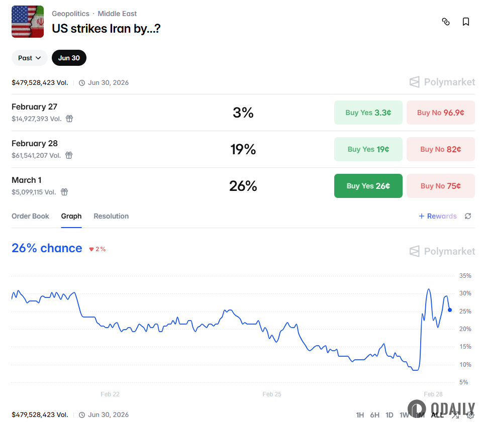 Polymarket เปิดเผยความน่าจะเป็นของเหตุการณ์ "สหรัฐฯ โจมตีอิหร่านก่อนวันที่ 1 มีนาคม" เพิ่มขึ้นเป็น 26%