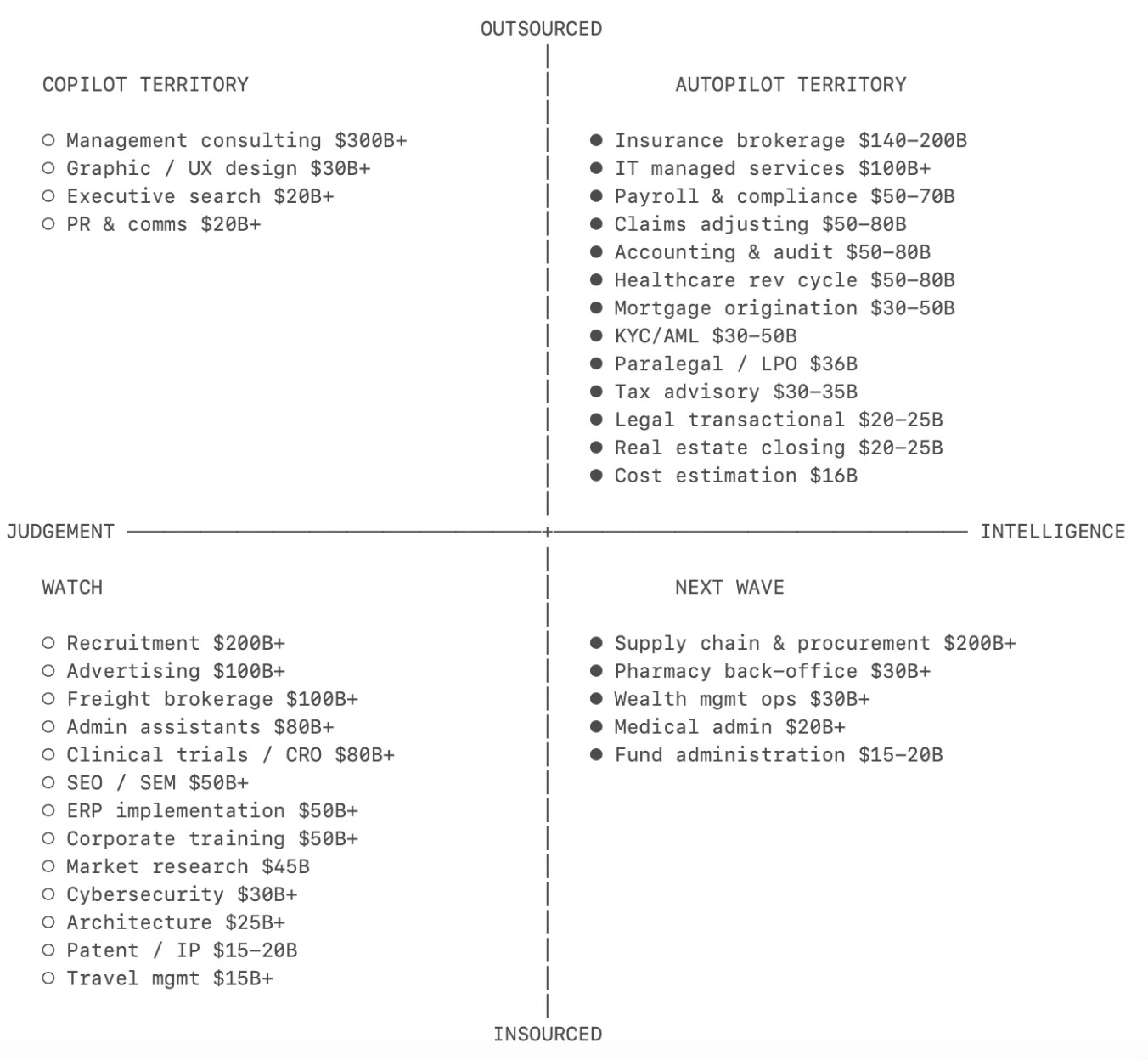 ผู้เขียนวิเคราะห์โอกาสในการทำให้บริการต่างๆ เช่น ประกันภัย บัญชี การแพทย์ กฎหมาย IT การจัดซื้อ การสรรหาบุคลากร และที่ปรึกษา เป็นอัตโนมัติทีละส่วน พร้อมแผนภาพเมทริกซ์โอกาสที่วาดตามสองมิติ "สติปัญญา vs การตัดสินใจ" และ "เอาท์ซอร์ส vs ภายใน" ซึ่งมีค่าอ้างอิงสำหรับทั้งผู้ประกอบการและนักลงทุนด้าน AI