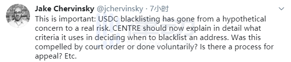 ผู้เชี่ยวชาญด้านกฎหมายหลักทรัพย์และที่ปรึกษาทั่วไปของ Compound กล่าวว่า: เหตุผลนี้มีความสำคัญเนื่องจากข้อกังวลในบัญชีดำของ USDC (การดำเนินการ) ได้กลายเป็นความเสี่ยงที่แท้จริง ขณะนี้ศูนย์ควรให้รายละเอียดเกณฑ์ที่ใช้ในการตัดสินใจว่าเมื่อใดควรขึ้นบัญชีดำที่อยู่ ถูกบังคับตามคำสั่งศาลหรือสมัครใจ? มีขั้นตอนการอุทธรณ์หรือไม่? เป็นต้น