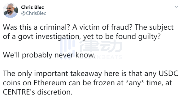 Chris Blec ผู้เฝ้าดู DeFi และนักวิเคราะห์ถามว่า: นี่เป็นอาชญากรหรือไม่? เหยื่อของการฉ้อโกง? เป็นเพราะรัฐบาลกำลังตรวจสอบว่ายังไม่ถูกตัดสินหรือไม่? เราอาจไม่มีทางรู้ จุดสำคัญประการเดียวที่นี่คือ USDC สามารถตรึงโทเค็น USDC ใดๆ บน Ethereum ได้ตลอดเวลาตามที่เห็นสมควร