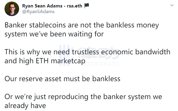 Ryan Sean Adams ผู้ก่อตั้งบริษัทการลงทุน cryptocurrency Mythos Capital และผู้สนับสนุน Ethereum แสดงความคิดเห็นว่า: "Stablecoins ของธนาคารไม่ใช่ระบบเงินไร้เงินที่เรารอคอย นั่นเป็นเหตุผลที่เราต้องการแบนด์วิธทางเศรษฐกิจที่ไว้วางใจได้และมูลค่าตามราคาตลาด ETH ที่สูง เงินสำรองของเรา สินทรัพย์ต้องไม่ถูกธนาคาร หรือเราแค่จำลองระบบธนาคารที่เรามีอยู่แล้ว"