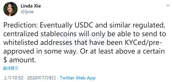 Linda Xie อดีตผู้จัดการผลิตภัณฑ์ของ Coinbase และผู้ร่วมก่อตั้ง ScalarCapital คาดการณ์ว่าในที่สุดแล้ว USDC และเหรียญ Stablecoins แบบรวมศูนย์ที่ได้รับการควบคุมที่คล้ายกันจะถูกส่งไปยังที่อยู่ที่อนุญาตพิเศษซึ่งได้รับ KYCed หรือได้รับการอนุมัติล่วงหน้าในทางใดทางหนึ่งเท่านั้น และอาจจะมีการจำกัดจำนวน เธอเชื่อว่าการขึ้นบัญชีดำที่อยู่ USDC เป็นสิ่งที่หลีกเลี่ยงไม่ได้และจะเกิดขึ้นในอนาคต USDC ไม่เคยอ้างว่าเป็น Stablecoin แบบกระจายอำนาจ USDC ยังคงมีค่าเนื่องจากประสิทธิภาพการทำธุรกรรม Stablecoin ทั้งแบบรวมศูนย์และแบบกระจายศูนย์จะอยู่ร่วมกันใน DeFi