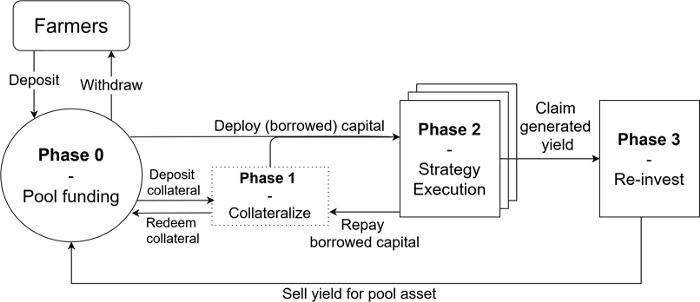 ในระยะที่ 1 สินทรัพย์ในกลุ่มกองทุนจะได้รับการจำนำเพื่อยืมสินทรัพย์อื่นบนแพลตฟอร์มการให้ยืม เช่น Compound, Aave หรือ Maker ขั้นตอนนี้ไม่จำเป็นและสามารถข้ามได้ จุดประสงค์หลักของขั้นตอนนี้คือการใช้สินทรัพย์อื่น (ไม่ใช่สินทรัพย์ดั้งเดิมในกลุ่ม) เพื่อดำเนินกลยุทธ์การขุดสภาพคล่อง ตัวอย่างเช่น ETH ในกลุ่ม SimpleYield ETH สามารถใช้เพื่อยืม Stablecoin DAI ผ่าน Maker ได้