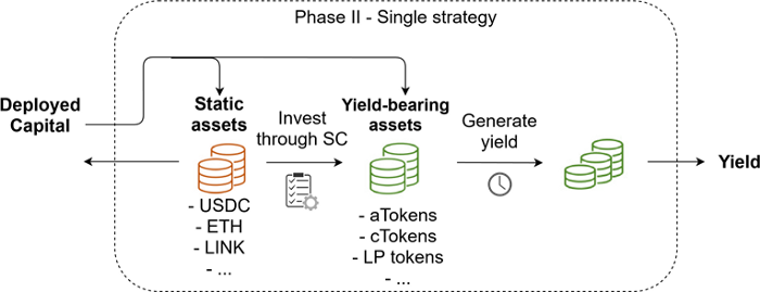 ขั้นตอนที่ 2 เกี่ยวข้องกับกลยุทธ์ผลตอบแทนที่มีระดับความซับซ้อนต่างกัน ดังที่แสดงในแผนภาพด้านล่าง ในขั้นตอนนี้ผู้คนกำลังเสนอสินทรัพย์ที่ไม่ก่อให้เกิดผลตอบแทน (โทเค็นสีแดง) หรือสินทรัพย์ที่ให้ผลตอบแทน (โทเค็นสีเขียว) เมื่อเวลาผ่านไป โทเค็นสีเขียวสร้างรายได้และเพิ่มขึ้นอย่างมาก ตัวอย่างเช่น กลุ่ม SimpleYield ETH ใช้ ETH เพื่อยืม DAI แล้วฝาก DAI ไว้ใน Compound ผ่าน Compound SimpleYield ได้รับโทเค็น cDAI ที่สร้างผลตอบแทนและโทเค็น COMP จากโปรแกรมการขุดสภาพคล่องของ Compound