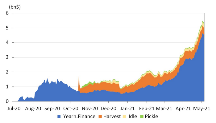 ในปีที่ผ่านมา มีโปรโตคอล Yield Aggregator จำนวนมากเกิดขึ้น แม้ว่า Framework ทั่วไปจะคล้ายกันแต่แต่ละอันก็มีสไตล์ของตัวเอง Idle Finance เปิดตัวเวอร์ชันแรกในปี 2019 ซึ่งจะฝากเงินเข้า PLF ด้วยอัตราดอกเบี้ยสูงสุด Yearn Finance ได้รับแรงบันดาลใจจากกลไกการขุดสภาพคล่องของ Compound ได้ขยายโมเดลนี้ในเดือนกรกฎาคม 2020 โดยเปิดตัว Vaults กลยุทธ์ที่ซับซ้อนมากขึ้นนอกเหนือจากผลิตภัณฑ์ Earn หลังจากนั้นกลไกการขุดสภาพคล่องประเภทต่างๆ ก็ปรากฏขึ้น Harvest Finance และ Pickle Finance ใช้โทเค็น LP สำหรับการขุดสภาพคล่องโดยเฉพาะ