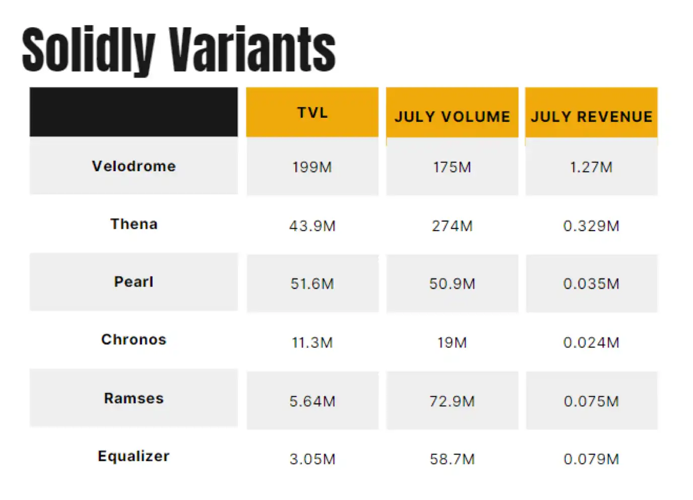 ในบรรดาส้อมทั้ง 6 นี้ Velodrome ถือเป็นราชาแห่งส้อม Solidly อย่างไม่มีปัญหา มีเพียง Thena เท่านั้นที่มีปริมาณการซื้อขายมากกว่า Velodrome ในเดือนที่ผ่านมา