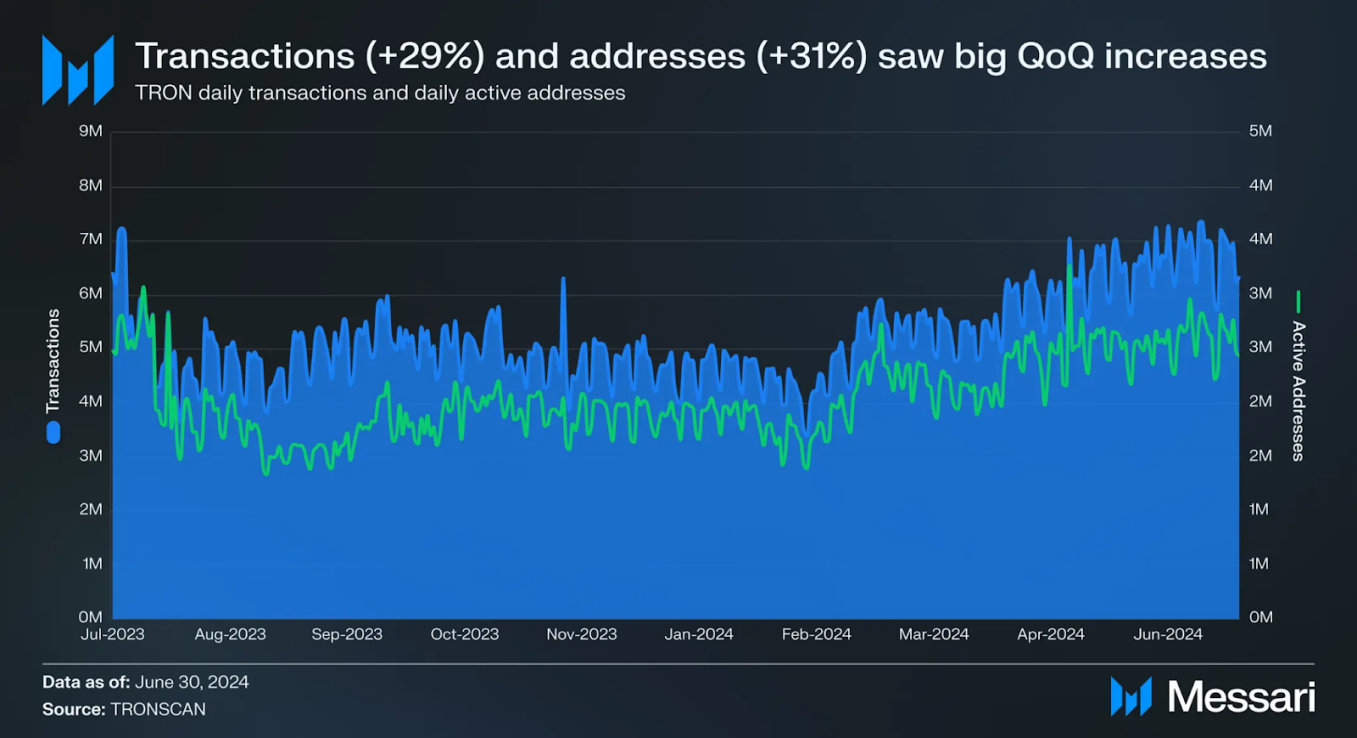 ข้อมูล Messari แสดงให้เห็นว่ากิจกรรมออนไลน์ของ Tron (ธุรกรรม ที่อยู่ที่ใช้งาน ที่อยู่ใหม่ ฯลฯ) เพิ่มขึ้นอย่างต่อเนื่องในไตรมาสที่สอง และปริมาณธุรกรรมเฉลี่ยต่อวันเพิ่มขึ้น 29% ไตรมาสต่อไตรมาส จาก 4.8 ล้านเป็น 6.3 ล้าน. ปริมาณธุรกรรมในเดือนมิถุนายน (202.6 ล้าน) สูงสุดเมื่อเทียบกับเดือนใดๆ ในปี 2567 ที่อยู่ที่ใช้งานเฉลี่ยรายวันเพิ่มขึ้น 31% เดือนต่อเดือน จาก 1.5 ล้านเป็น 2 ล้าน