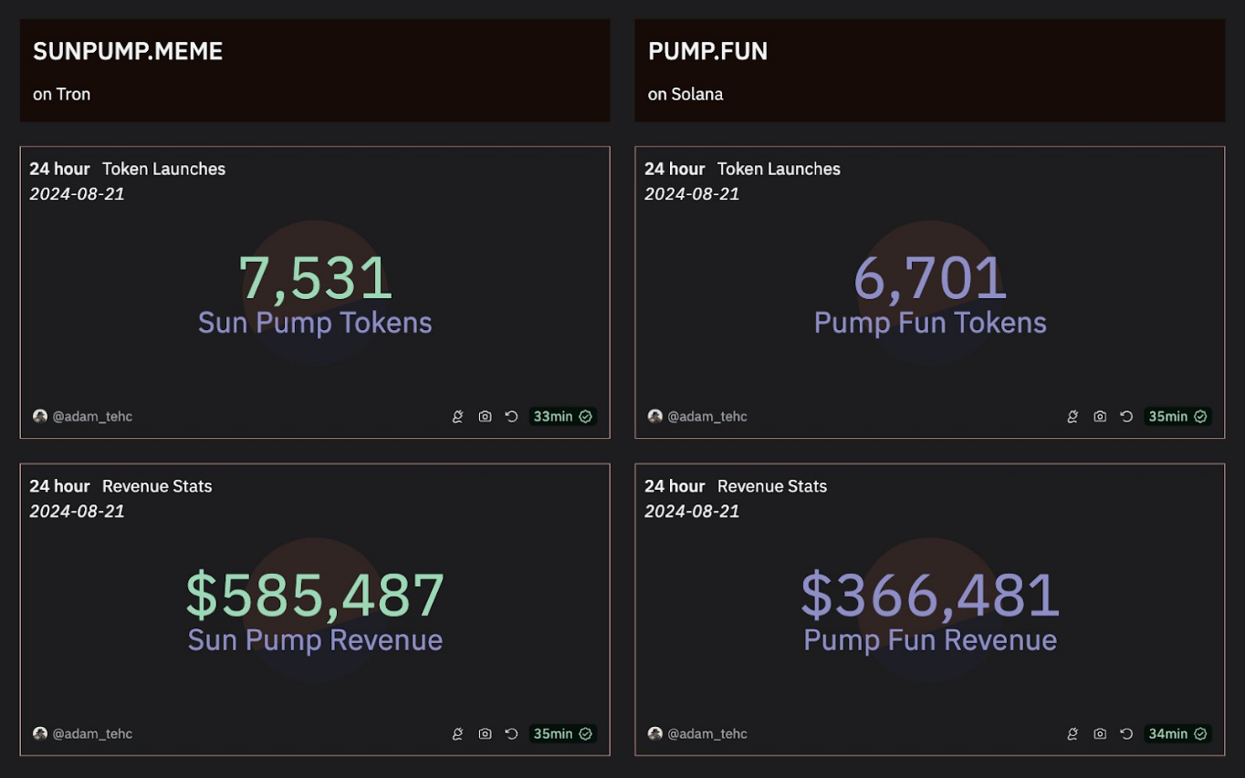 เมื่อวันที่ 21 สิงหาคม SunPump ได้รับประมาณ 3.65 ล้าน TRX จากการออก Memecoin 7,531 เหรียญ ซึ่งเทียบเท่ากับประมาณ 567,000 ดอลลาร์ ตัวเลขนี้เกินรายรับ SOL 2,575 SOL Pump.fun ที่ได้รับจากการออกโทเค็น 6,941 โทเค็น มูลค่ากว่า 368,000 ดอลลาร์ เมื่อเร็วๆ นี้ SunPump แซงหน้า Pump.fun ในรายรับรายวัน ซึ่งถือเป็นก้าวสำคัญสำหรับตลาด Memecoin ซึ่งบ่งชี้ว่าได้เริ่มสูบฉีดผู้ใช้จากแพลตฟอร์มต่างๆ