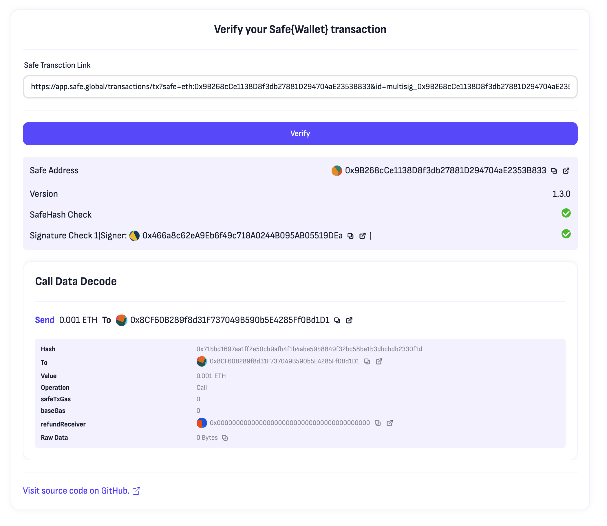 เรายังตรวจสอบเครื่องมือนี้ด้วย ตามที่แสดงในรูปภาพ คุณเพียงแค่วางลิงก์การแชร์ธุรกรรมในหน้าปลอดภัย คุณสามารถอ่านข้อมูลแบ็คเอนด์ที่ปลอดภัยโดยอัตโนมัติและตรวจสอบความถูกต้องของค่าแฮชและลายเซ็นของธุรกรรมเดิมได้อย่างอิสระ กล่าวโดยย่อ หากคุณแน่ใจว่าการวิเคราะห์ข้อมูลการโทรในรูปภาพเป็นธุรกรรมที่คุณต้องการ และผ่านการตรวจสอบ "SafeHash Check" และ "Signature Check" แล้ว คุณจะคิดได้ว่า "นี่คือธุรกรรมที่คุณต้องการส่ง" และ "คุณได้ลงนามอย่างถูกต้อง"