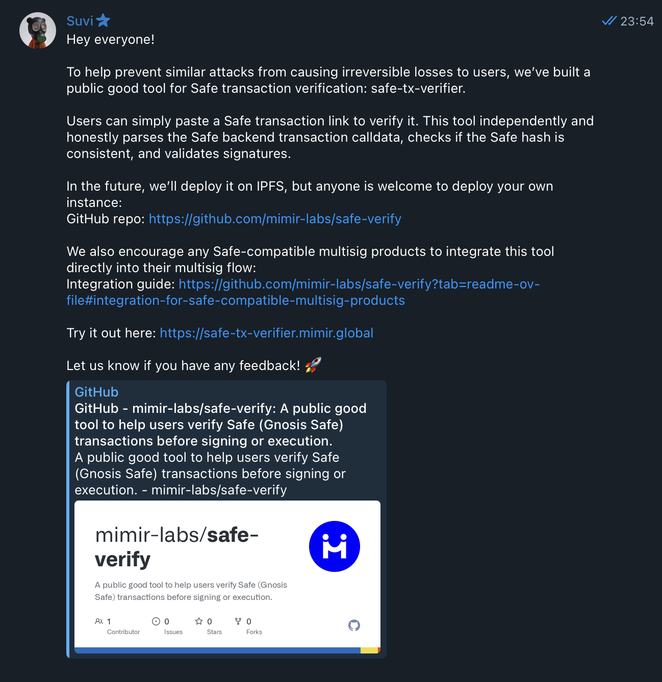 ชุมชนตอบสนองอย่างรวดเร็วต่อการโจมตีแบบฟรอนต์เอนด์ของ Safe เราพบในกลุ่มเทเลแกรมอย่างเป็นทางการของ Safe ว่ามีคนจัดเตรียมเครื่องมือแยกวิเคราะห์ธุรกรรมของ Safe อิสระ ซึ่งดูง่ายกว่าและตรงไปตรงมามากกว่า