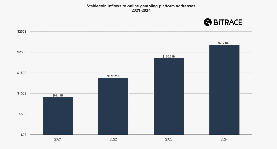 โดยคำนึงถึงว่ากิจกรรมเสี่ยงส่วนใหญ่เกิดขึ้นในเครือข่าย Ethereum และ TRON Bitrace จึงกำหนดที่อยู่บล็อคเชนที่ใช้โดยนิติบุคคลผิดกฎหมายในการรับ ส่ง และจัดเก็บ stablecoin (erc 20 _usdt, erc 20 _usdc, trc 20 _usdt, trc 20 _usdc) ในเครือข่ายทั้งสองนี้ให้เป็นที่อยู่ที่มีความเสี่ยงสูง ในช่วงปี 2024 ที่ผ่านมา มูลค่ารวมของการชำระเงินที่ได้รับจากที่อยู่ที่มีความเสี่ยงสูงดังกล่าวสูงถึง 649 พันล้านดอลลาร์สหรัฐ ซึ่งสูงกว่าปีก่อนหน้าเล็กน้อย