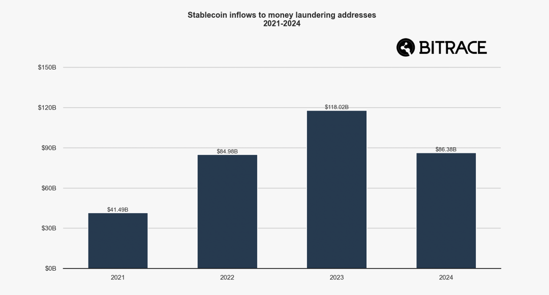 ที่อยู่บล็อคเชนที่เกี่ยวข้องกับการฟอกเงินได้รับ stablecoin มูลค่ารวม 86.3 พันล้านดอลลาร์ในปี 2024 ลดลงเล็กน้อยจากปี 2023 และเท่ากับปี 2022 ตัวเลขนี้อาจบ่งชี้ว่ากิจกรรมการบังคับใช้กฎหมายหลักและกิจกรรมการออกกฎหมายควบคุมของหน่วยงานนโยบายหลักที่เกิดขึ้นในช่วงสองปีที่ผ่านมาได้ควบคุมสถานการณ์อาชญากรรมฟอกเงินในอุตสาหกรรม crypto ได้อย่างมีประสิทธิภาพ