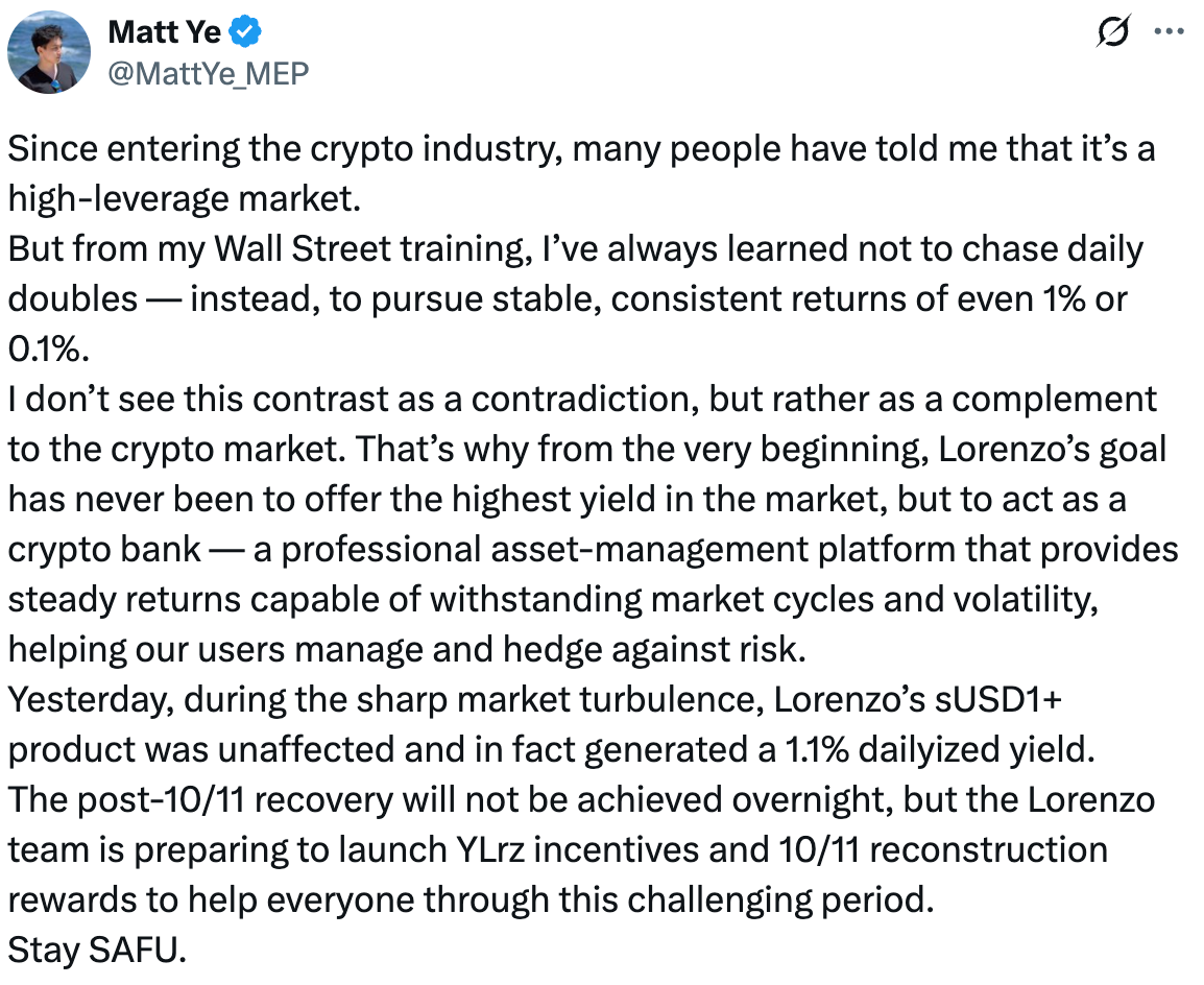 โดยสรุป บทเรียนจากเหตุการณ์ 11 ตุลาคมนั้นชัดเจน นั่นคือ ในช่วงเวลาสุดขั้วของความล้มเหลวทางโครงสร้างจุลภาคหลายจุด ความเป็นกลางทางบัญชีไม่ได้หมายความว่าจะดำเนินการได้อย่างปลอดภัย ผลตอบแทนที่สูงของ HLP ใน "วันวิกฤต" เกิดจากค่าพรีเมียมจากการชำระบัญชีของคู่สัญญา ซึ่งยากที่จะทำซ้ำได้ในระยะยาว อย่างไรก็ตาม sUSD 1+ ใช้การบริหารความเสี่ยงเชิงวิศวกรรมเพื่อปกป้องเงินต้นในสถานการณ์ที่รุนแรง และสร้าง APY ส่วนเกินอย่างต่อเนื่องในช่วงเวลาปกติ เปลี่ยนความผันผวนให้เป็นกระแสเงินสดที่วัดผลได้ นี่ไม่ใช่ชัยชนะของ "การเดิมพันในทิศทาง" แต่เป็นชัยชนะของ "การใช้ประโยชน์จากความผันผวน" รอคอยผลงานในอนาคตของลอเรนโซ