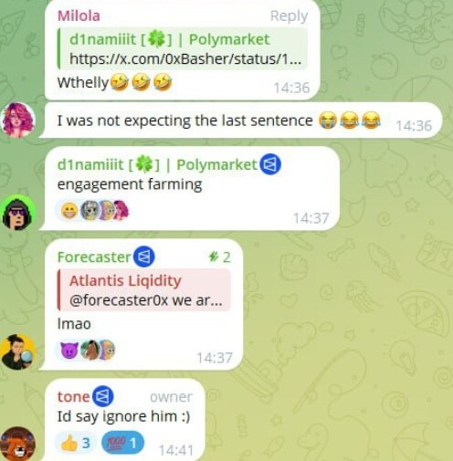 ข้อความที่รั่วไหลใน Telegram แสดงให้เห็นว่าสมาชิกในกลุ่มยังล้อเลียนผู้ใช้ที่สูญเสียป้ายชุมชน Polymarket ของตน และพูดเล่นเกี่ยวกับการรายงานพวกเขาให้ทีมทราบอีกด้วย