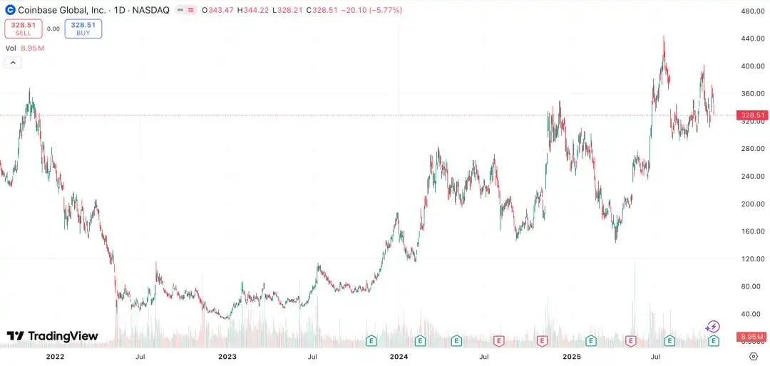หากมองย้อนกลับไปตั้งแต่ปี 2023 จนถึงปัจจุบัน ราคาหุ้นของ Coinbase ซึ่งเป็นหุ้นคริปโทเคอร์เรนซีตัวแรก พุ่งสูงขึ้นราวกับรถไฟเหาะ จากจุดต่ำสุดที่ 30 ดอลลาร์สหรัฐฯ สู่ระดับกว่า 300 ดอลลาร์สหรัฐฯ ในปัจจุบัน ซึ่งไม่ได้เกิดจากโชคช่วย แต่เกิดจากแนวทางสองทางของ Coinbase และ USDC