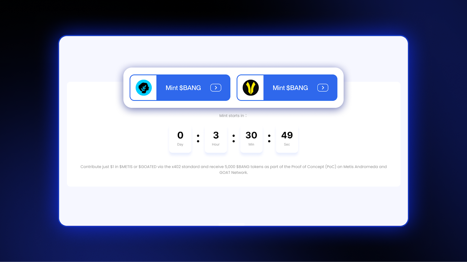 2. เพียงสนับสนุน $1 ให้กับ $xMETIS หรือ $xGOATED ผ่านมาตรฐาน x402 เพื่อรับ 5,000 โทเค็น $BANG ซึ่งเป็นส่วนหนึ่งของ METIS Andromeda และ GOATNetwork PoC