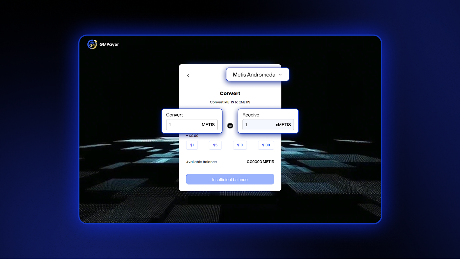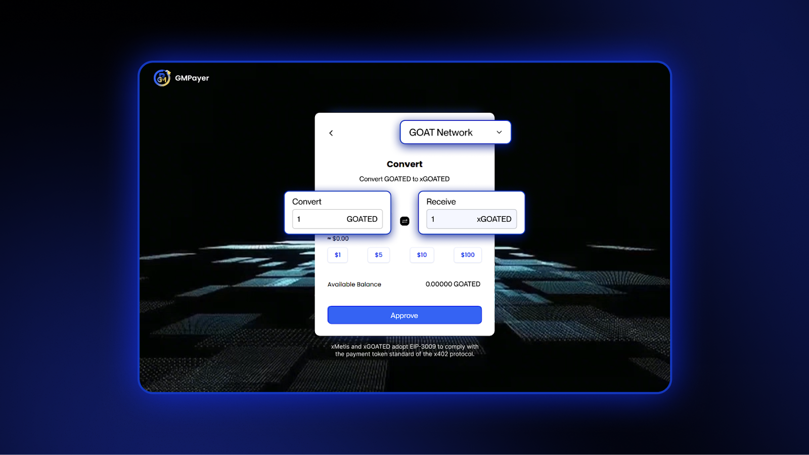 GMPayer รองรับทั้ง Metis Andromeda และ GOAT Network และช่วยให้คุณแปลงโทเค็นระหว่าง $METIS/$xMETIS และ $GOATED/$xGOATED ในอัตราส่วน 1:1