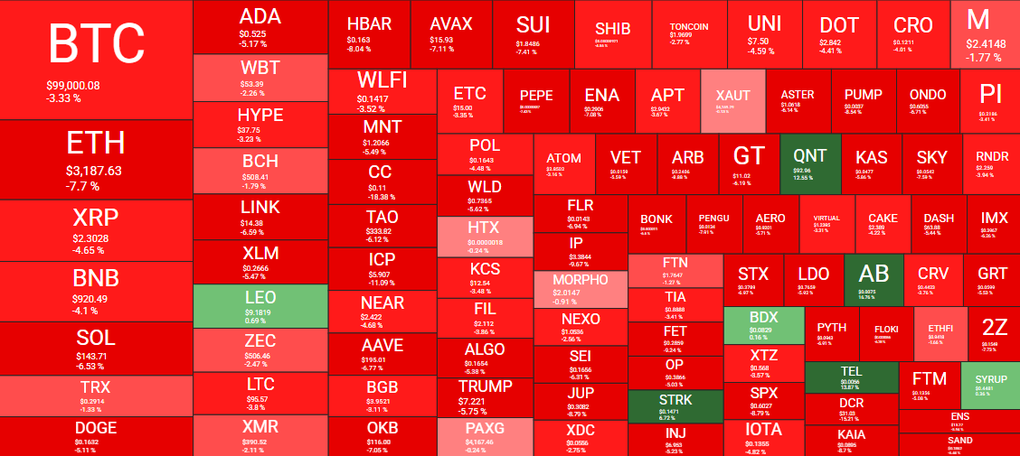 นอกจาก BTC, ETH, SOL และ BNB แล้ว ตลาด altcoin ยังคงปรับตัวลดลงอย่างต่อเนื่อง ข้อมูลจาก Quantifycrypto ระบุว่า กว่า 90% ของคริปโตเคอร์เรนซี 100 อันดับแรกตามมูลค่าตลาด ได้ปรับตัวลดลงในช่วง 24 ชั่วโมงที่ผ่านมา