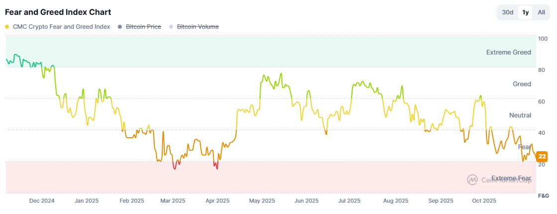 ตามข้อมูลของ CoinMarketCap ดัชนี Fear & Greed ยังคงลดลงอย่างต่อเนื่อง โดยยังคงอยู่ในภาวะ "กลัวสุดขีด" นานกว่าหนึ่งสัปดาห์ โดยความรู้สึกของตลาดร่วงลงสู่จุดต่ำสุด