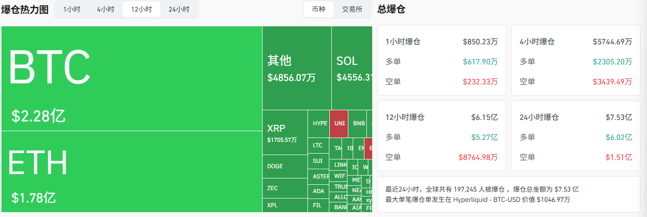 ในตลาดอนุพันธ์ ข้อมูลจาก Coinglass ระบุว่า มูลค่าการชำระบัญชีรวมทั่วทั้งเครือข่ายสูงถึง 615 ล้านดอลลาร์สหรัฐฯ ในช่วง 12 ชั่วโมงที่ผ่านมา โดยในจำนวนนี้ สถานะซื้อ (Long Position) คิดเป็นมูลค่า 527 ล้านดอลลาร์สหรัฐฯ BTC และ ETH ได้รับผลกระทบหนักที่สุดจากการชำระบัญชี โดยมีมูลค่า 228 ล้านดอลลาร์สหรัฐฯ และ 178 ล้านดอลลาร์สหรัฐฯ ตามลำดับ