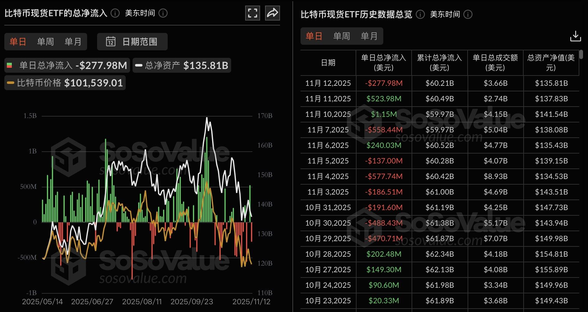 ข้อมูล ETF สปอตเป็นตัวบ่งชี้สำคัญในการสังเกตกองทุนรวมตลาดทุน ข้อมูลจาก SoSoValue ระบุว่า ตั้งแต่วันที่ 29 ตุลาคม กองทุน ETF สปอต BTC มีเงินทุนไหลออกสุทธิจำนวนมากหลายครั้ง โดยเงินทุนไหลออกสุทธิในวันที่ 4 พฤศจิกายนสูงถึง 577 ล้านดอลลาร์ แม้ว่าจะมีเงินทุนไหลเข้าสุทธิเพียงช่วงสั้นๆ ในวันที่ 6 และ 11 พฤศจิกายน (ไม่รวมเงินทุนไหลเข้าสุทธิ 1.15 ล้านดอลลาร์ในวันที่ 10 พฤศจิกายน) แต่โดยรวมแล้วเงินทุนไหลออกอย่างต่อเนื่องนับตั้งแต่เดือนพฤศจิกายน