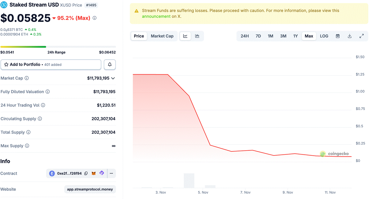 - วิกฤตการณ์ทางการเงินแบบ Stream Finance (3-4 พฤศจิกายน): โปรโตคอล "CeDeFi" รายงานการขาดทุน 93 ล้านดอลลาร์สหรัฐจากผู้จัดการกองทุนภายนอก และระงับการถอนเงินทั้งหมด เหตุการณ์นี้ทำให้ xUSD ซึ่งเป็น stablecoin ดั้งเดิมของโปรโตคอลเกิดการแตกตัวทันที และก่อให้เกิดผลกระทบต่อ DeFi ในวงกว้างขึ้น ส่งผลให้สินทรัพย์มูลค่าประมาณ 285 ล้านดอลลาร์สหรัฐถูกระงับการใช้งาน