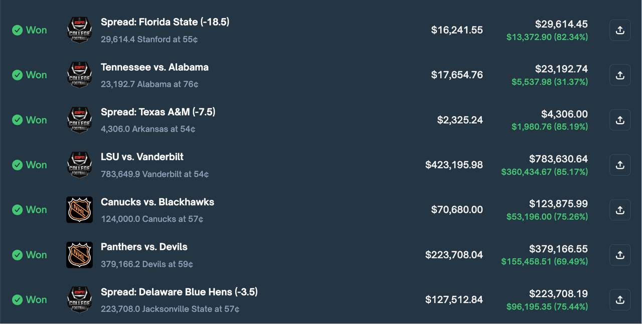 ในการแข่งขัน CFB ระหว่างฮูสตันและ UCF ด้วยจำนวนเงินเดิมพัน 745,000 ดอลลาร์สหรัฐฯ เขาได้รับกำไรไปทั้งหมด 687,200 ดอลลาร์สหรัฐฯ ซึ่งมีอัตราผลกำไร 92.25% ซึ่งถือเป็นกำไรสูงสุดในบัญชีของเขาจนถึงปัจจุบัน โดยอยู่อันดับหนึ่งจากการเดิมพัน 108 ครั้ง