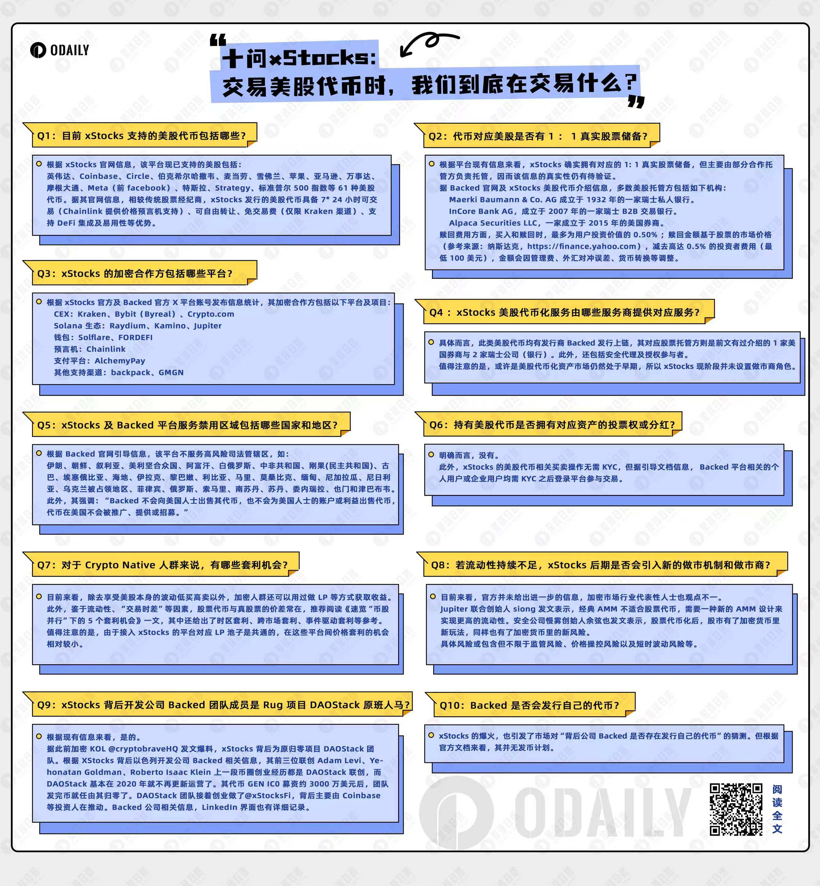 ก่อนหน้านี้ Odaily Planet Daily เคยให้คำแนะนำโดยละเอียดเกี่ยวกับ xStocks และกลไกพื้นฐานของแพลตฟอร์มการซื้อขายหุ้นสหรัฐฯ ในรูปแบบโทเค็น ในบทความชื่อ "10 คำถามเกี่ยวกับ xStocks: เรากำลังซื้อขายอะไรกันแน่เมื่อซื้อขายโทเค็นหุ้นสหรัฐฯ?" เมื่อมองย้อนกลับไป หลักการพื้นฐานและรูปแบบการบริหารสินทรัพย์ของมันก็ยังไม่เปลี่ยนแปลงมากนัก ความแตกต่างก็คือ หลังจากที่แพลตฟอร์มการแปลงหุ้นสหรัฐฯ เป็นโทเค็นหลายแห่งได้เริ่มปรับตัวแล้ว บริษัทยักษ์ใหญ่แบบดั้งเดิมก็เริ่มตื่นตัวเช่นกัน