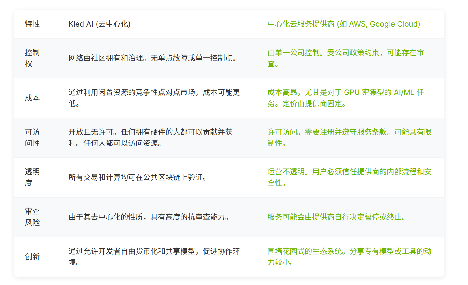 เพื่อให้เข้าใจถึงนวัตกรรมของ Kled AI อย่างถ่องแท้ จำเป็นต้องเปรียบเทียบกับบริการคลาวด์คอมพิวติ้งแบบรวมศูนย์แบบดั้งเดิมที่ให้บริการโดยบริษัทยักษ์ใหญ่ เช่น Amazon Web Services (AWS), Google Cloud และ Microsoft Azure แม้ว่าแพลตฟอร์มเหล่านี้จะมีประสิทธิภาพสูง แต่ก็มีข้อจำกัดที่ Kled AI มุ่งหวังที่จะแก้ไข
