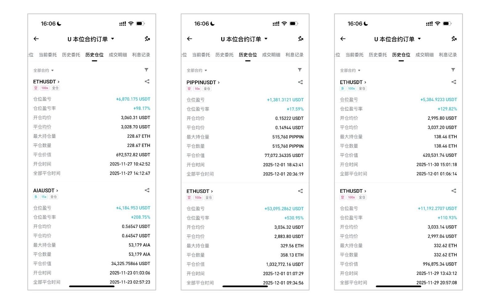 ตั้งแต่วันที่ 20 พฤศจิกายนถึง 1 ธันวาคม เธอเน้นการซื้อขายสัญญา Ethereum (ETH) โดยใช้ช่วงราคาผันผวนระหว่าง 2950-3050 ดอลลาร์สำหรับการซื้อขายความถี่สูง เธอเปิดสถานะซื้อและขายทุกวันตามความผันผวนของตลาด และทำกำไรซ้ำแล้วซ้ำเล่าภายในช่วงราคานี้ ด้วยความเข้าใจอย่างลึกซึ้งในความผันผวนของตลาด เธอจึงค่อยๆ สะสมกำไรจำนวนมาก