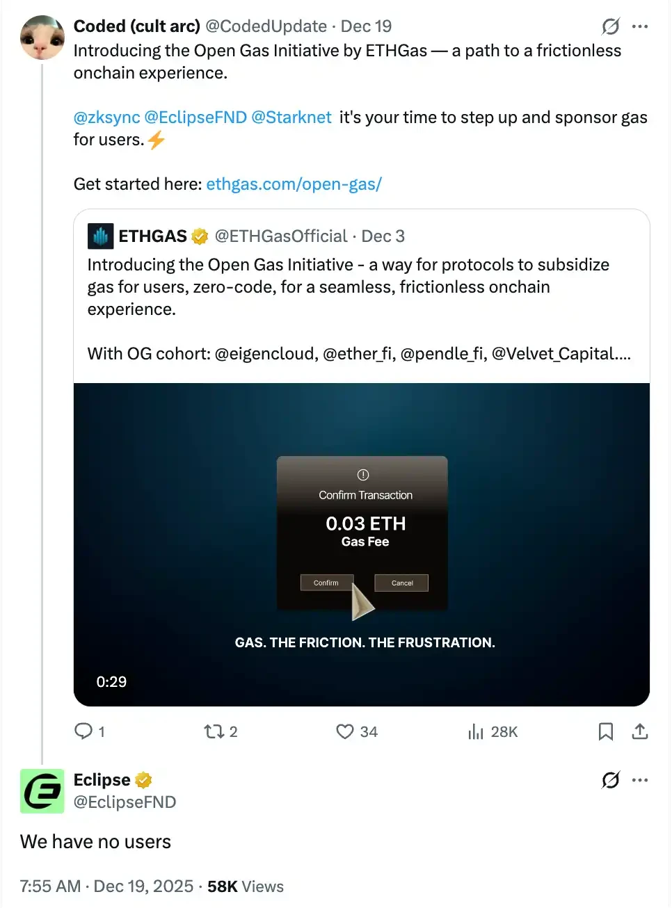 นับตั้งแต่เริ่มก่อตั้ง โครงการ Eclipse ก็ตกอยู่ในความขัดแย้งมากมายที่ดึงดูดความสนใจจากชุมชน ตั้งแต่ผู้ก่อตั้งเข้าไปพัวพันกับเรื่องอื้อฉาวเกี่ยวกับการล่วงละเมิดทางเพศ ไปจนถึงการเปลี่ยนแปลงผู้นำและซีอีโอหลายครั้ง เมื่อไม่นานมานี้ Eclipse ได้โพสต์บนโซเชียลมีเดียว่าเป็นส่วนหนึ่งของการศึกษาทางสังคมวิทยาเป็นเวลา 36 เดือนที่ดำเนินการโดยมหาวิทยาลัยฮาร์วาร์ด "การศึกษาของเราเสร็จสิ้นแล้ว ขอขอบคุณสำหรับเวลาและความร่วมมือของคุณ" และตอนนี้ ในโพสต์แนะนำโครงการใหม่ ETHGAS บัญชีทางการของ Eclipse ได้ระบุอย่างตรงไปตรงมาว่า "เราไม่มีผู้ใช้"
