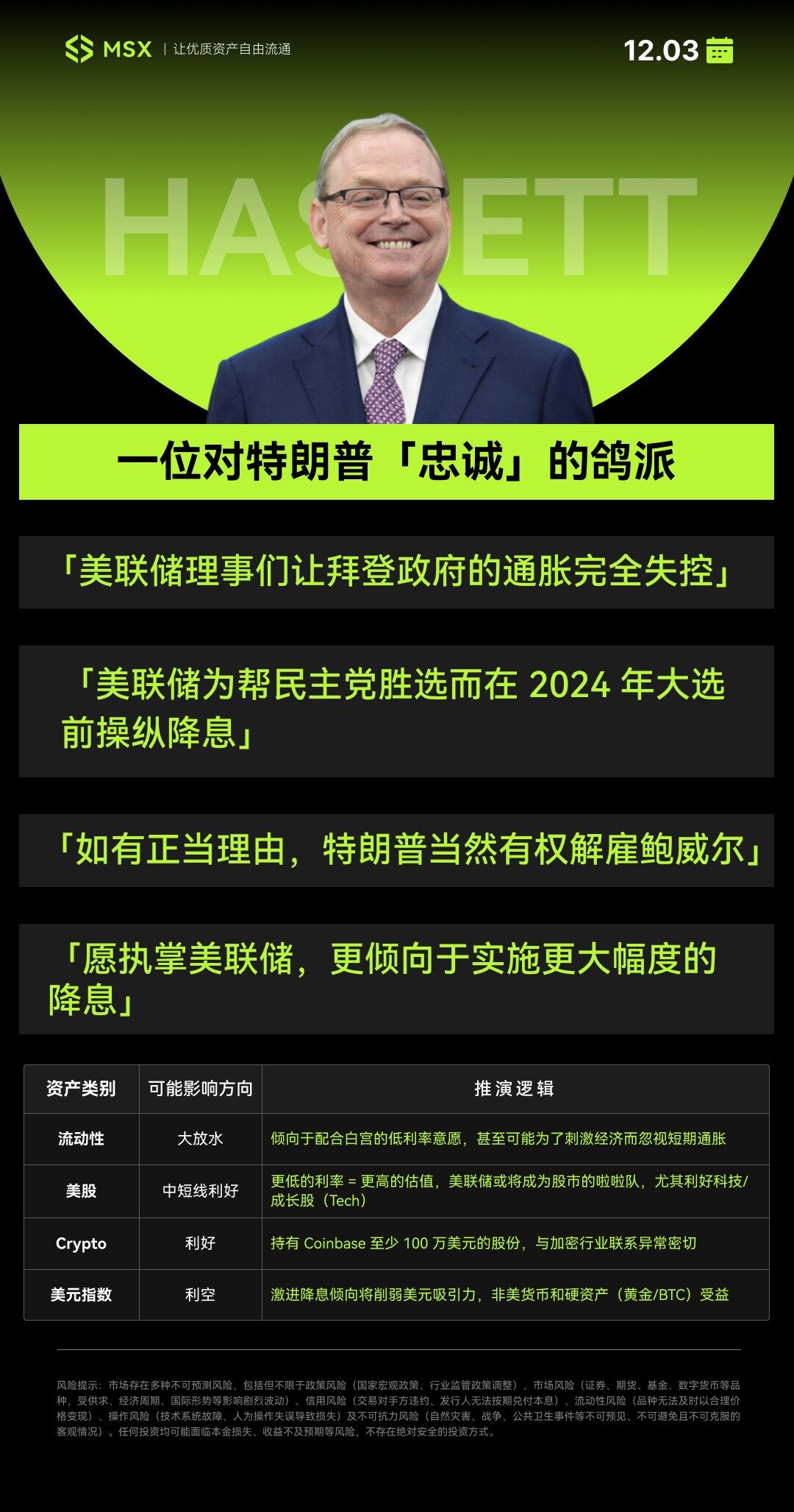 หากผู้ที่ได้รับเลือกในท้ายที่สุดคือ "นกพิราบผู้ภักดี" ที่มีเควิน แฮสเซ็ตต์เป็นตัวแทน ธนาคารกลางสหรัฐฯ ก็มีแนวโน้มสูงที่จะปล่อยสัญญาณสภาพคล่องที่รุนแรงมากขึ้นในระยะสั้น โดยทำตามแนวทางของทำเนียบขาว ตลาดหุ้น Nasdaq และ Bitcoin อาจก่อให้เกิดความปั่นป่วนทางอารมณ์ แต่ต้นทุนอาจเป็นการสูญเสียการควบคุมความคาดหวังด้านเงินเฟ้ออีกครั้ง และการกัดเซาะความน่าเชื่อถือของดอลลาร์เพิ่มเติม (อ่านเพิ่มเติม: " มองไปข้างหน้าถึงผู้นำเฟดคนใหม่: แฮสเซ็ตต์, Coinbase Holdings และ 'นกพิราบผู้ภักดี' ของทรัมป์ ")