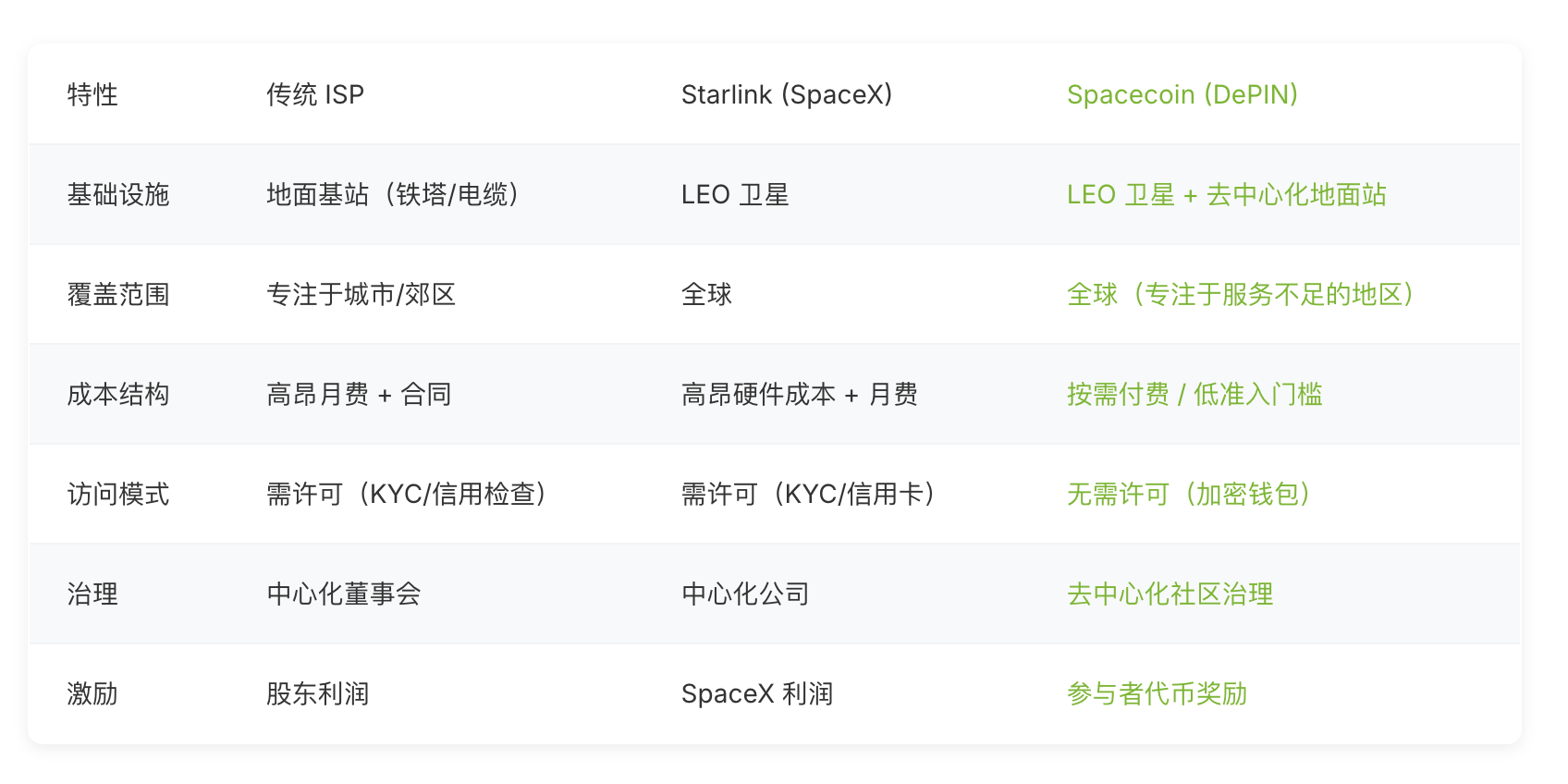 ตาราง: Spacecoin เทียบกับ ISP แบบดั้งเดิม เทียบกับ Starlink