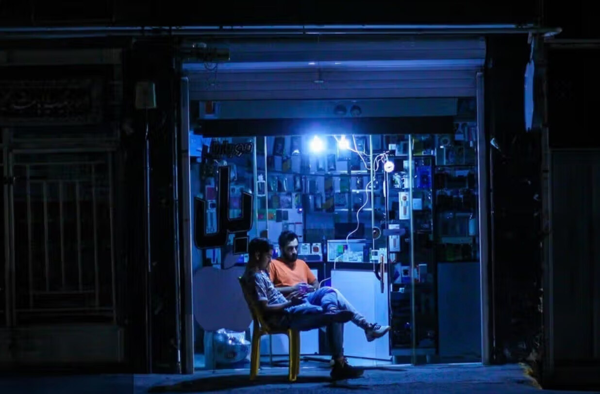 คำอธิบายภาพ: ชายอิหร่านสองคนนั่งอยู่หน้าร้านมือถือของพวกเขา ภายในร้านมีเพียงไฟฉุกเฉินส่องสว่าง เพราะไฟฟ้าดับทำให้ถนนมืดสนิท