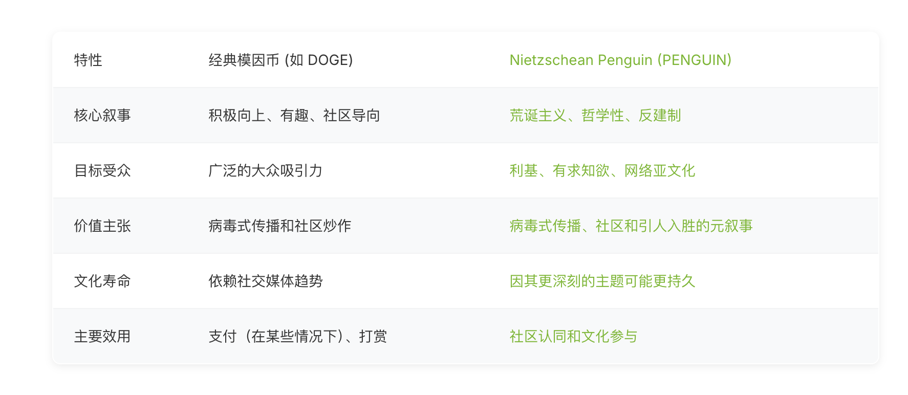 คุณลักษณะเหรียญมีมคลาสสิก (เช่น DOGE)Nietzschean Penguin (PENGUIN)เรื่องเล่าหลักร่าเริง เป็นมิตร น่าสนุก มุ่งเน้นชุมชนความไร้สาระ เชิงปรัชญา ต้านสถาบันกลุ่มเป้าหมายดึงดูดมวลชนในวงกว้างเฉพาะกลุ่ม มีความอยากรู้อยากเห็น วัฒนธรรมย่อยออนไลน์ข้อเสนอคุณค่าการแพร่กระจายไวรัสและการเก็งกำไรของชุมชนการแพร่กระจายไวรัส ชุมชน และเรื่องเล่าเมตาที่น่าสนใจอายุขัยทางวัฒนธรรมขึ้นอยู่กับเทรนด์โซเชียลมีเดียอาจยั่งยืนกว่าเนื่องจากธีมที่ลึกซึ้งกว่าประโยชน์หลักการชำระเงิน (ในบางกรณี) ให้ทิปการยอมรับจากชุมชนและการมีส่วนร่วมทางวัฒนธรรม