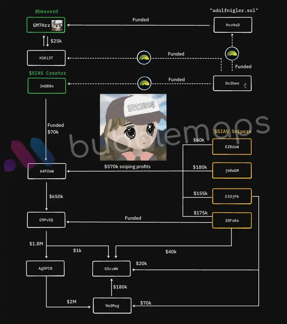 Bubblemaps ระบุว่าจากที่อยู่ Solana สาธารณะของ Beaver พบที่อยู่ที่เชื่อมโยง "2mQB8o" และที่อยู่ที่เชื่อมโยงนี้ได้เปิดตัวโทเค็น $SIAS บน pump.fun $SIAS พุ่งแตะมูลค่าตลาด 6 ล้านดอลลาร์ภายใน 7 นาทีหลังเปิดตัว จากนั้นอีก 10 นาทีต่อมา ก็ร่วงลงสู่ศูนย์อย่างรวดเร็วหลัง dev ขายออกจำนวนมาก