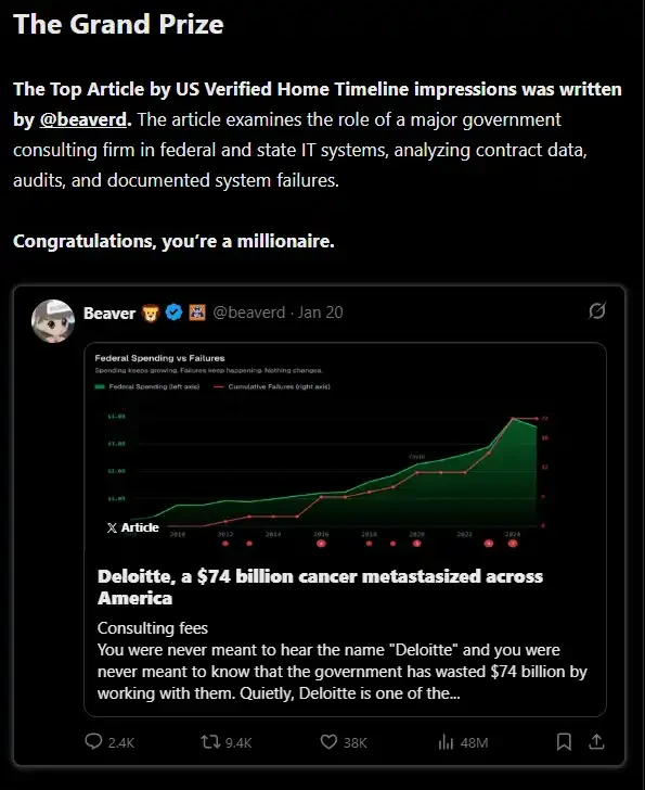 วันที่ 4 กุมภาพันธ์ X ได้ประกาศผู้ชนะการแข่งขันบทความมูลค่า 1 ล้านดอลลาร์ โดย @beaverd ได้รับรางวัลสูงสุด 1 ล้านดอลลาร์ด้วยบทความเรื่อง "Deloitte, a $74 billion cancer metastasized across America (Deloitte มะเร็งมูลค่า 74 พันล้านดอลลาร์ที่แพร่กระจายทั่วอเมริกา)"