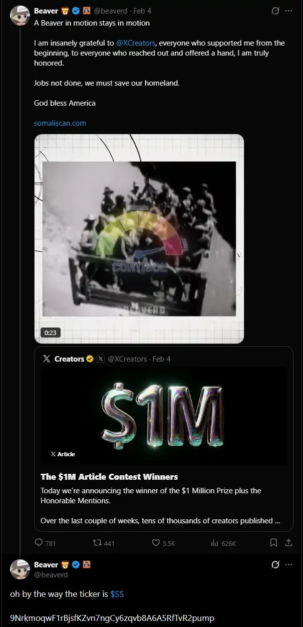 ดังนั้น Beaver จึงถูกมองว่าเป็นฮีโร่โดยผู้เล่นในแวดวงภาษาอังกฤษที่มีแนวโน้มขวา (โดยเฉพาะในสหรัฐฯ) หลังจากที่ X ประกาศว่าเขาได้รับรางวัลบทความ 1 ล้านดอลลาร์ เขาก็ได้โปรโมต Somaliscan ทันที และแนบ CA ไว้ในความคิดเห็นของทวีต: