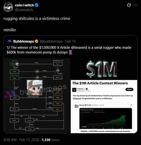 ในแวดวงภาษาอังกฤษ Beaver ก็ถือเป็นผู้เล่น meme coin ที่ค่อนข้างมีชื่อเสียง ดังนั้นชัยชนะของเขาจึงสร้างความตื่นเต้นให้กับวงการคริปโต อย่างไรก็ตาม เมื่อวันก่อน Bubblemaps ได้โพสต์ทวีตกล่าวหาเขา โดยเรียกเขาว่า "นักสร้างโปรเจกต์หลอกลวงต่อเนื่อง (serial rugger)" ซึ่งทำกำไรได้ 600,000 ดอลลาร์จากการจัดการราคาเหรียญ