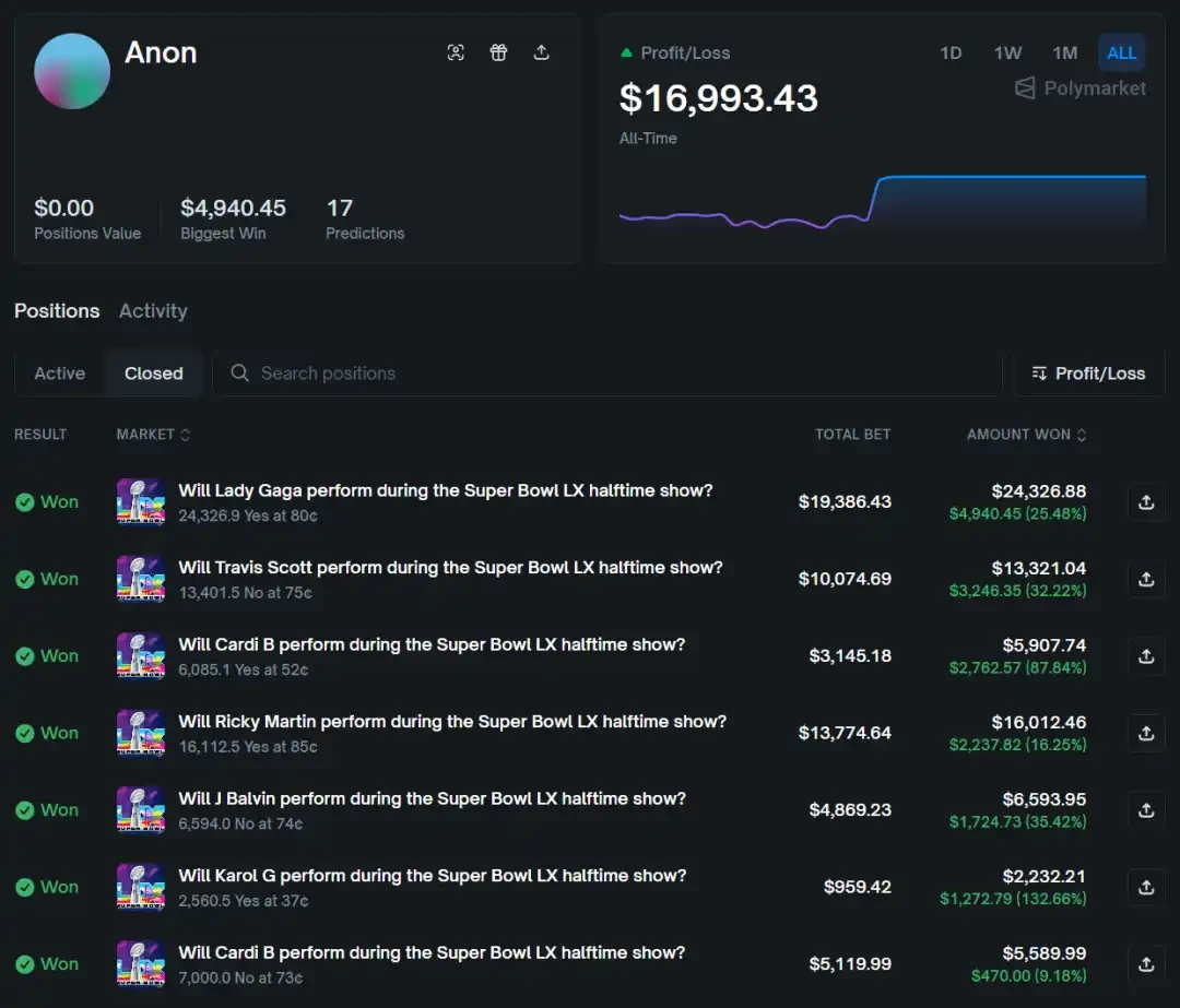 - บัญชีใหม่ของ Polymarket วางเดิมพันหนักประมาณ 80,000 ดอลลาร์ก่อนการแสดงพักครึ่ง Super Bowl ทำนายถูก 17 ครั้งจาก 19 การทำนายที่เกี่ยวข้อง ทำกำไร 17,600 ดอลลาร์ อัตราชนะที่เกือบสมบูรณ์แบบนี้ถูกชุมชนสงสัยอย่างกว้างขวางว่าเป็นการเทรดแบบมีข้อมูลภายใน