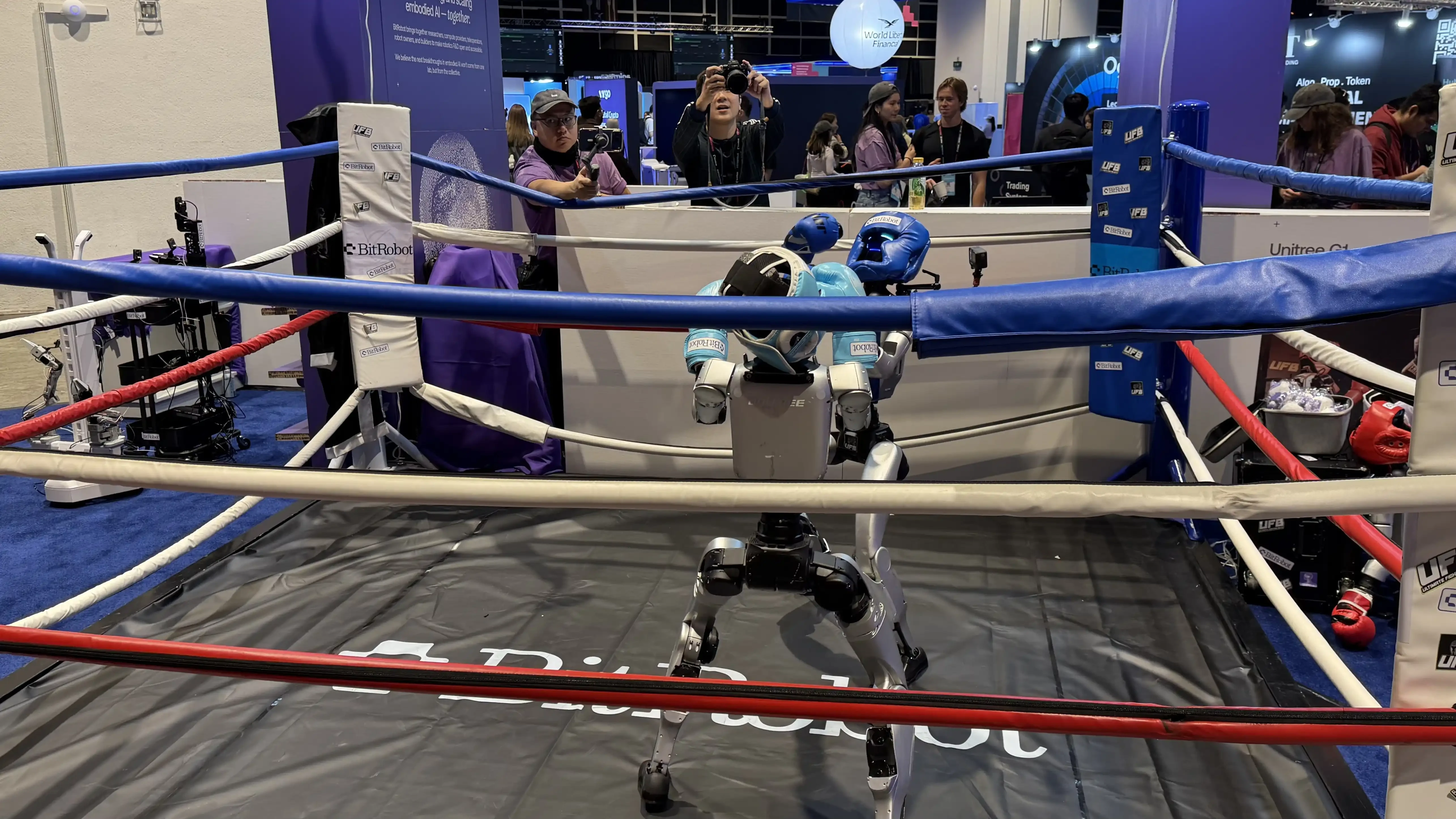 หุ่นยนต์สองตัวกำลังชกมวยบนเวที Consensus
