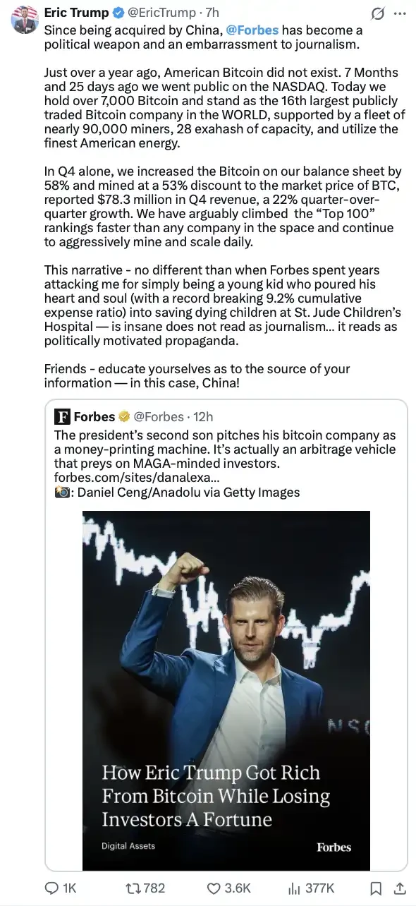 After the report, Eric Trump quickly fired back on X, accusing Forbes of being acquired by China, calling the report politically driven propaganda, and citing a string of operational data in rebuttal: 7,000 Bitcoin, nearly 90,000 mining rigs, and Q4 revenue of $78.3 million. Along the way, he also brought up a story from twenty years ago about fundraising for a children's hospital, trying to prove that Forbes has been targeting him, a "good guy."