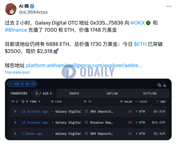 Địa chỉ Galaxy Digital OTC đã gửi 7.000 ETH vào CEX trong 2 giờ qua, trị giá 17,48 triệu USD