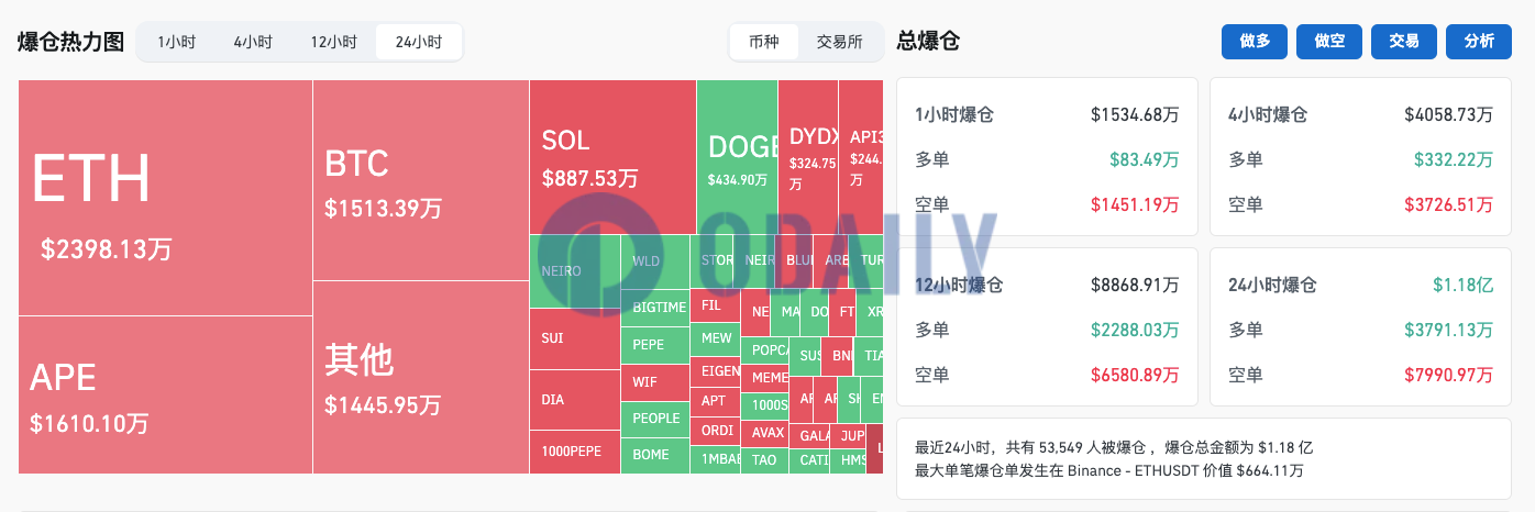 Trong 24 giờ qua, toàn bộ mạng đã thanh lý 118 triệu đô la Mỹ, với việc thanh lý chính là các lệnh bán và số tiền thanh lý APE đã vượt quá BTC