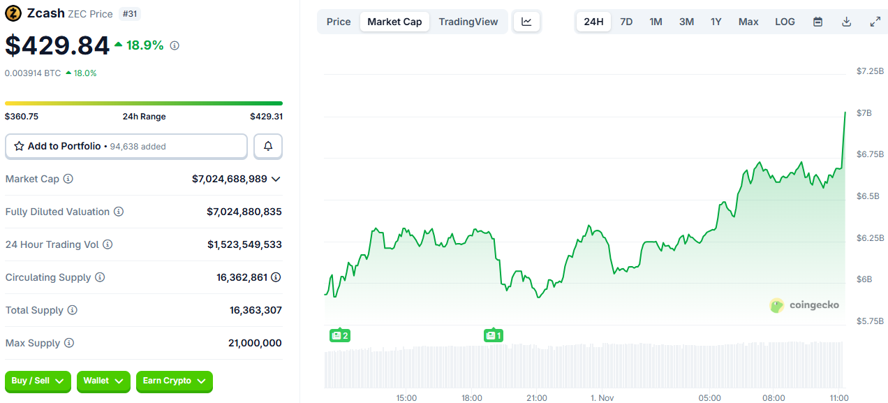 Vốn hóa thị trường của ZEC vượt quá 7 tỷ đô la, lập mức cao nhất mọi thời đại.