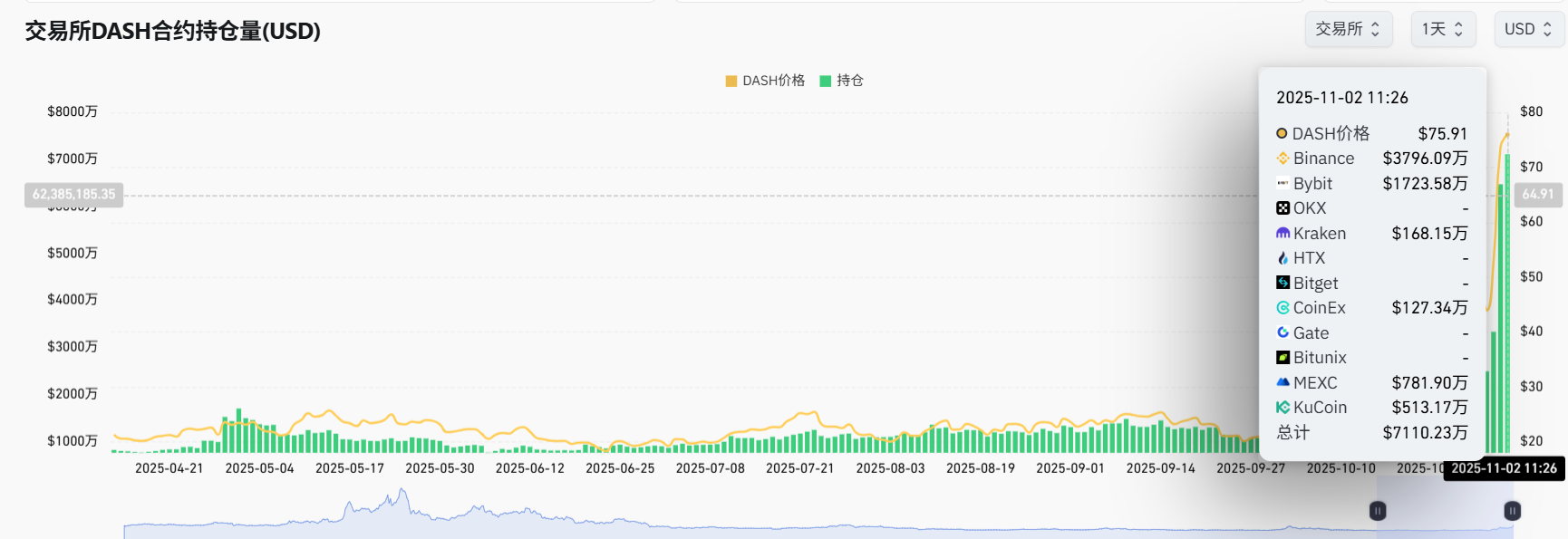 Theo dữ liệu của Coinglass, tổng số hợp đồng DASH đang mở trên toàn mạng lưới đạt 936.500 token, với giá trị thị trường vượt 70 triệu đô la, đạt 71,1023 triệu đô la, mức cao kỷ lục, tăng 84,41% trong 24 giờ. Trong số đó, hợp đồng DASH đang mở của Binance đạt 500.100 token, với giá trị thị trường là 17,2358 triệu đô la; hợp đồng DASH đang mở của Bybit đạt 227.200 token, với giá trị thị trường là 17,2358 triệu đô la.