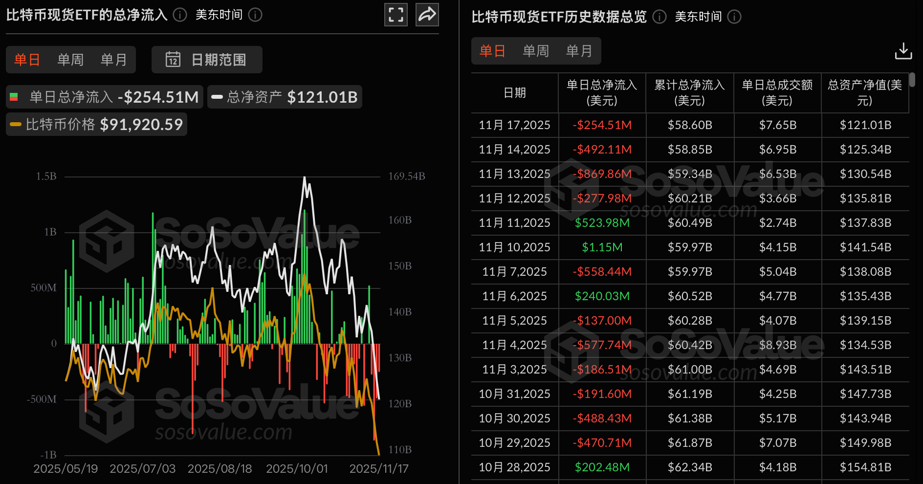 Theo dữ liệu từ SoSoValue, các ETF giao ngay Bitcoin đã chứng kiến dòng tiền chảy ra ròng là 255 triệu đô la vào ngày hôm qua (ngày 17 tháng 11, Giờ miền Đông).